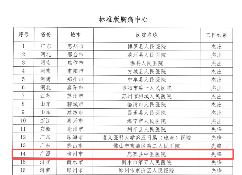 近日,国家放射与治疗临床医学研究中心、苏州工业园区东方华夏心血管健康研究院发布了2025年度全国胸痛中心质量管理工作结果,作为国家标准版胸痛中心认证医疗机构,鹿寨县中医医院胸痛中心获评“2025年度胸痛中心(标准版)质量管理先锋单位”,成为柳州市唯一获此国家级殊荣的医疗机构。