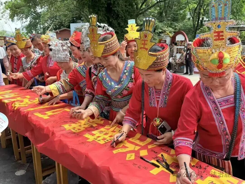 展演结束后,广场一侧的“铸牢中华民族共同体意识 共建法治鹿寨 万人签名同心行”横幅前,各族群众排起了长队签名。此举旨在让每一位参与者都成为法治建设和民族团结的践行者、传播者。