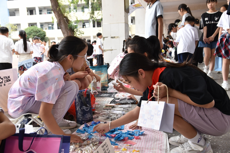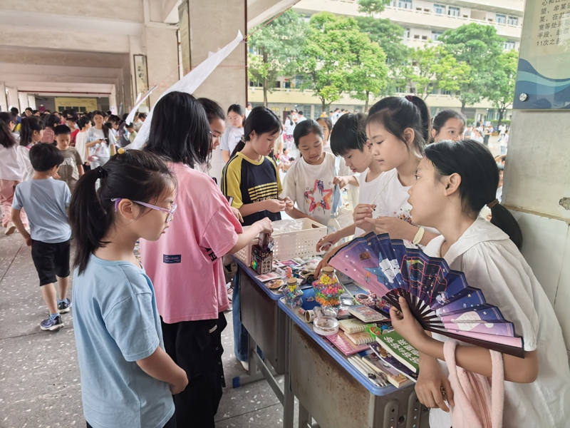 活动现场,每个班级都精心布置了自己的摊位。香囊、图书、小饰品、二手玩具……琳琅满目的商品吸引同学们驻足挑选。吆喝声、讨价还价声此起彼伏,有的摊位甚至打出了“买一个香囊送一本书”的促销口号。