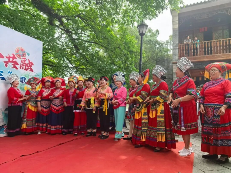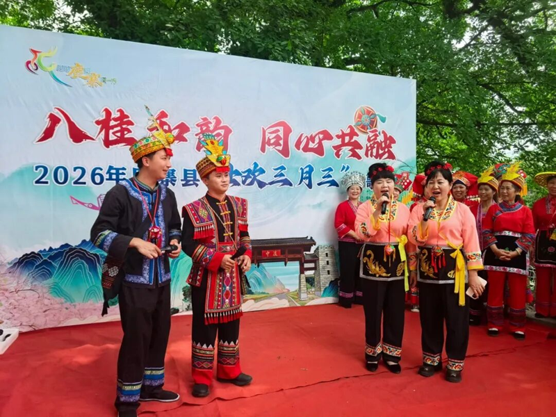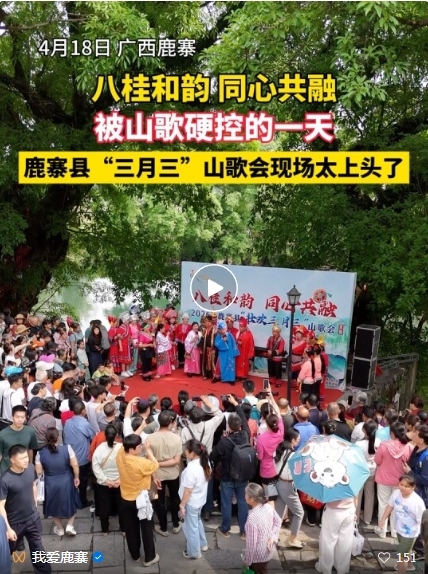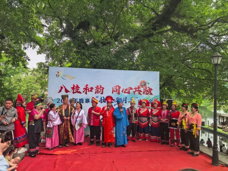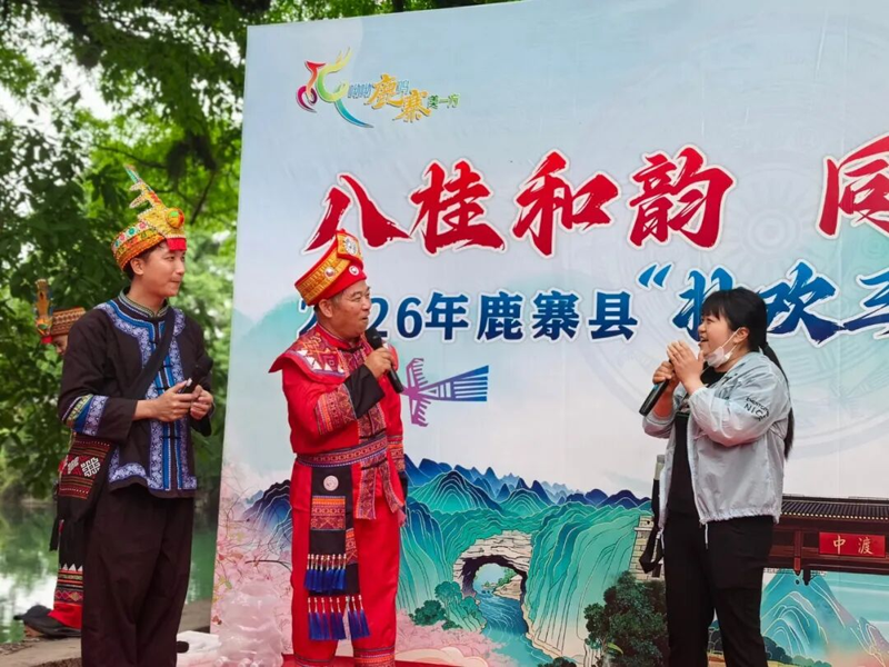 4月18日,2026年鹿寨县“桂在邻里 壮欢三月三”山歌会及非遗产品展销会在中渡古镇举行。活动组织了山歌对唱、歌圩交流和非遗产品展销,不仅让现场观众沉浸式体验民族文化的魅力,也让全国各地网友通过“鹿寨文旅”直播平台感受壮乡三月三的热烈氛围。