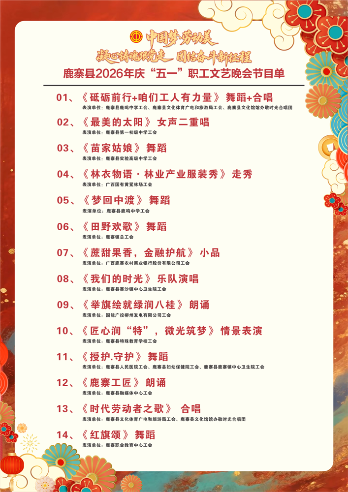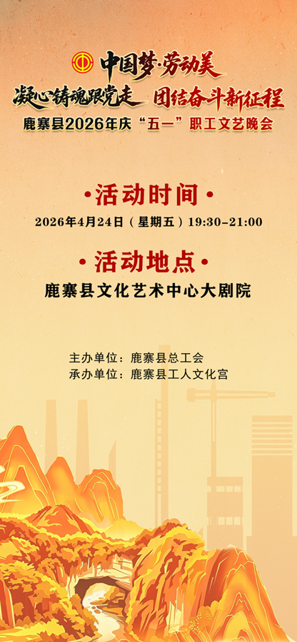 劳动创造幸福,实干成就伟业。为庆祝“五一”国际劳动节的到来,积极展现鹿寨职工昂扬奋进、积极进取的精神风貌,“中国梦·劳动美——凝心铸魂跟党走 团结奋斗新征程”鹿寨县2026年庆“五一”职工文艺晚会,于本周五(4月24日)晚上7:30在鹿寨县文化艺术中心大剧院隆重开演,欢迎广大职工朋友前来观看。