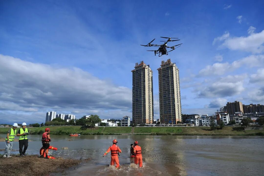随后,各部门迅速集结力量开展实战处置,针对道路、电力、通讯同时中断的突发状况,相关部门火速调配人员与机械设备,快速完成道路清障、线路抢修、信号恢复工作;公安部门现场设置警戒、实施交通管制,维护现场治安秩序;消防、卫健部门分别开展浮桥铺设、伤员转运救治工作,企业应急队伍利用无人机开展空中人员救援。同时,演练还模拟了高速公路在建工地滑坡、人员被困险情,顺利完成现场封控、伤员搜救、医疗救护、人员疏散转移、临时安置保障等一系列处置工作。针对龙兴水电站泄洪断电故障、河道无动力船只失控漂移、多名群众不慎落水等各类突发险情,各救援队伍分工协作、密切配合,运用冲锋舟、无人机抛投救生圈、遥控救生圈等专业设备开展立体化救援,成功化解各类安全隐患,构建起全流程闭环救援体系。
