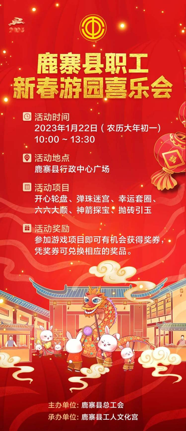 除了举行焰火晚会,春节期间还有哪些活动?小编从县总工会了解到,大年初一在行政中心广场,还将开展丰富多彩的新春游园活动,欢迎广大市民参与。