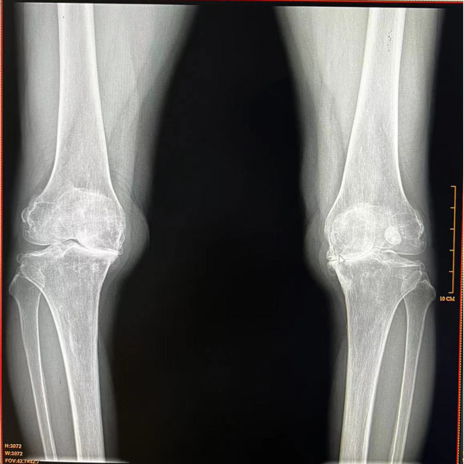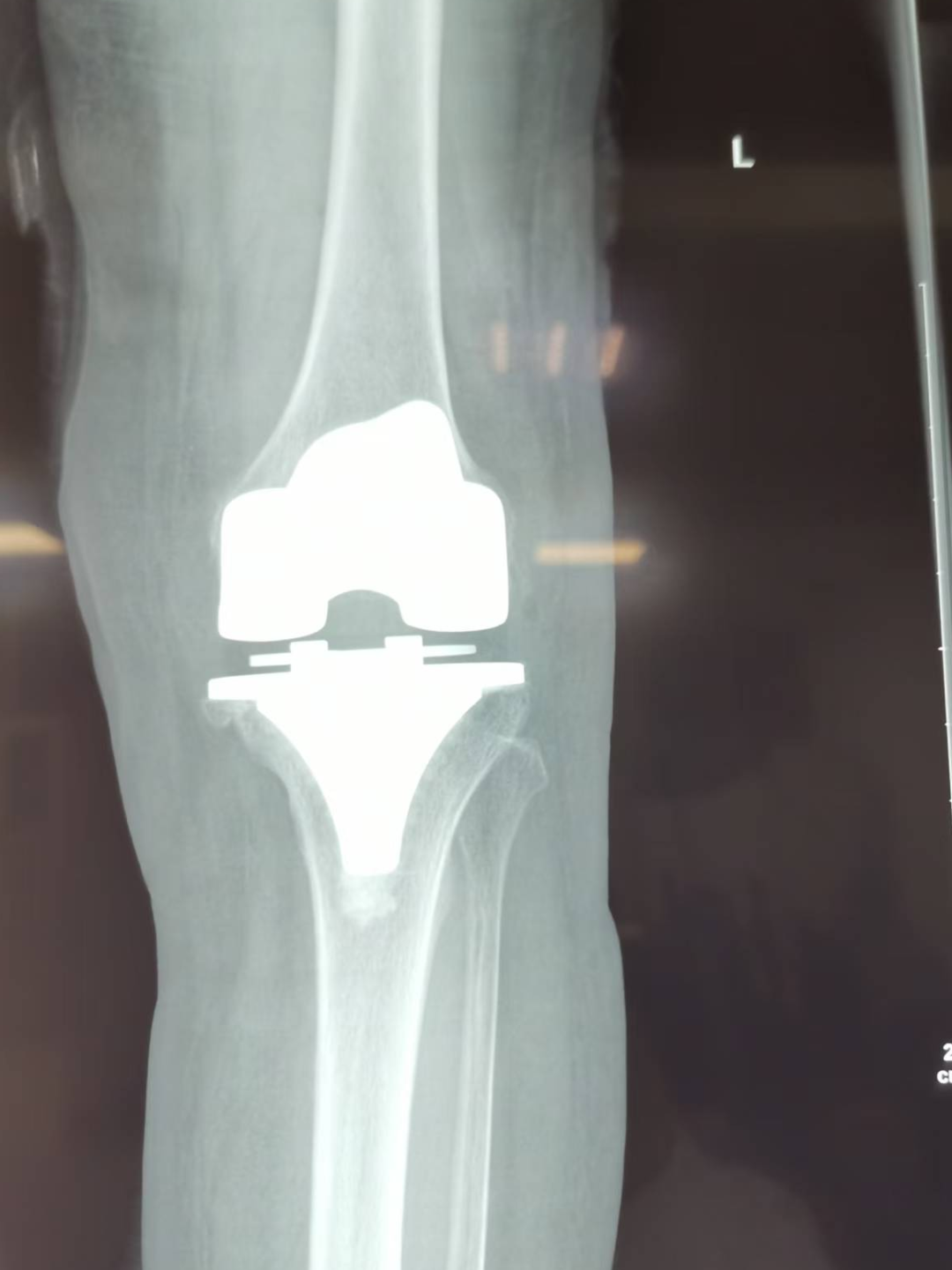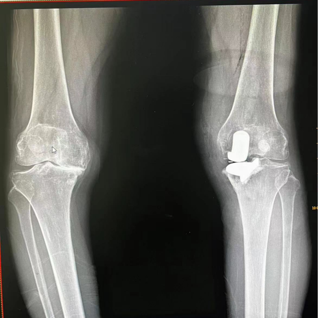 66岁的莫阿姨(化名),反复双膝关节疼痛、活动不利20年,伴关节弹响,行走、上下楼梯及深蹲时加重,经多年反复保守治疗未见好转,至今已严重影响生活质量,于是莫阿姨来到该院骨伤科就诊。骨伤科施能槐主任医师接诊后,详细询问病史及查体,诊断为双侧膝关节骨性关节病(重度),目前左膝疼痛为主,建议行左膝关节单髁置换术。患者及家属给予骨伤科团队充分的信任,希望通过手术解决谢阿姨多年的疼痛困扰。骨伤科团队经过术前检查及准备,在施能槐副院长带领下顺利完成左膝关节单髁置换手术。