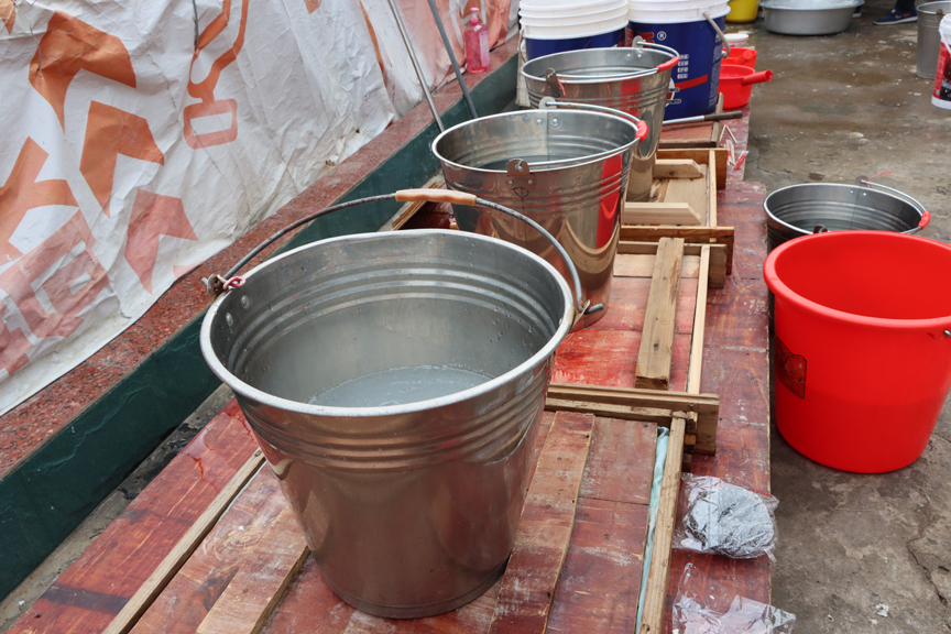 ▲用水桶装水压豆腐格,以缩短豆腐成品的时间