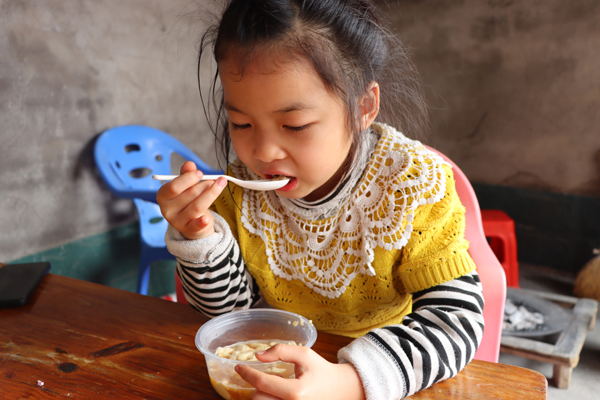 “来,大家来吃豆腐花。”陆阿婆热情吆喝着,盛了几碗豆腐花给大伙吃。她的小孙女早就等不及了,一上桌就吃了一大口,但因豆腐花太烫,她立即又吐了出来,还边嚷边吐舌头哈气,贪吃的模样让旁边的村民们都忍俊不禁。