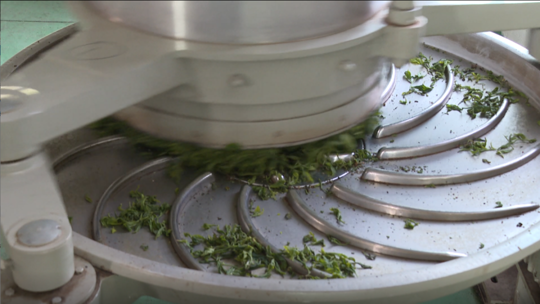 拉沟乡公敢瑶茶加工厂技术顾问陆师傅说:“当我们萎凋结束以后,我们茶叶就会上这个揉捻机,揉捻一个半小时左右,当茶叶成条率达到90%,细胞破碎率达到80%左右,我们就可以进行公敢茶的下一步关键工序——发酵。”