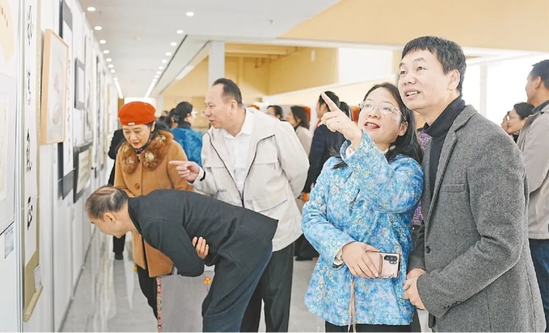 ▲近日,自治区妇联举办“树清廉家风 创最美家庭”清廉机关与清廉家庭融合共建活动。图为在廉洁文化作品展上,展出作品吸引夫妻并肩驻足观看。吴韵琴/摄