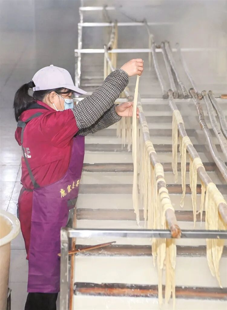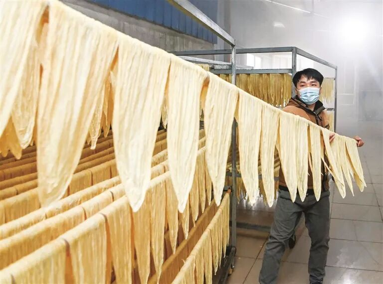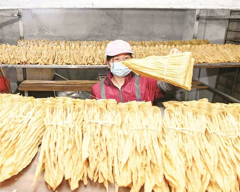 ▲工人把腐竹摆放到架子上