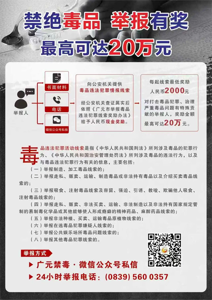 ●奖励机制:对查证属实的举报,将依据《广元市举报毒品违法犯罪线索奖励办法》给予奖励,最高可奖20万元。