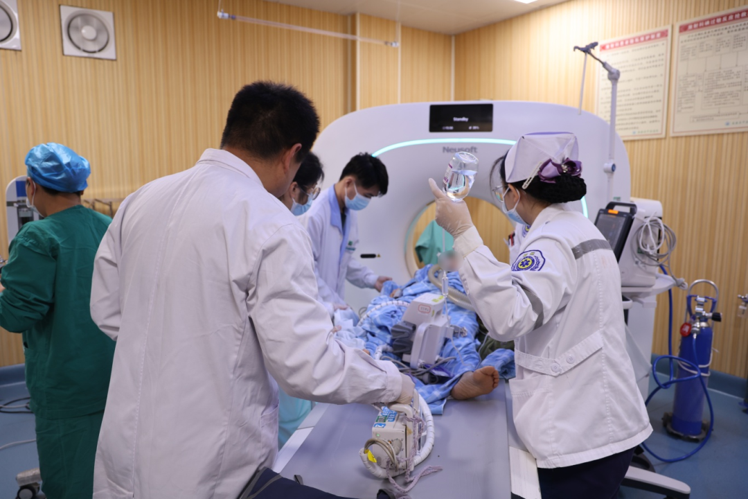 科室接诊医师第一时间启动卒中绿色通道,并紧急联络神经内科主任刘生。凭借丰富的临床经验,刘生主任当即远程预判其为高度怀疑颅内动脉瘤破裂出血,随即下达指令:立即完善院前检查,做好应急抢救准备。急诊团队火速响应,气管插管、机械通气……一系列抢救措施无缝衔接,为后续治疗赢得了至关重要的“时间窗”。