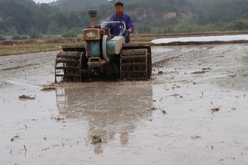 ▲鹿寨镇石路村村民在耙田备耕