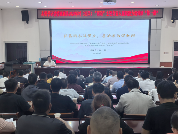 4月8日,鹿寨县2026年村(社区)“两委”主要负责人履职能力培训班在县委党校正式开班。县委书记杨毅为全县120名新一届村(社区)“两委”主要负责人讲授“开班第一课”。