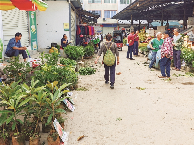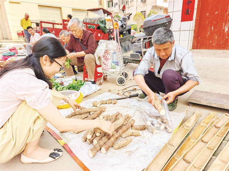 4月10日,农历二月二十三,又逢寨沙镇圩日。天刚蒙蒙亮,周边各村的乡亲们便挑着刚从地里采摘的瓜果蔬菜等农副产品早早赶来,一筐挨着一担,将产品沿着街巷两侧摆开。平日里静谧的街巷与农贸市场,很快被客家话的寒暄声、此起彼伏的吆喝声“填满”,整个镇子都热闹了起来。