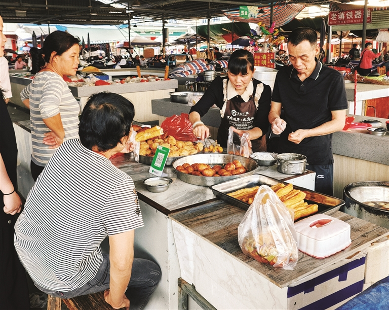 除了米粉,圩市里的小吃也藏着数不尽的舌尖惊喜。其中最绕不开的,便是在市场坚守了将近50年的邓氏糍粑摊。这家摊位从上世纪70年代便已扎根在此,现由邓忠胜、张雪平夫妇俩经营。这一口软糯香甜,承载了一代又一代寨沙人的童年记忆。“我是1988年从我家婆那一代传承下来的,很多顾客都认可我们家的糍粑。”张雪平一边麻利地给顾客打包糍粑,一边笑着说道。