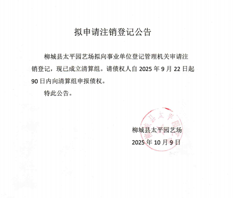 其他重要信息公开柳城县太平园艺场拟申请注销登记公告 |