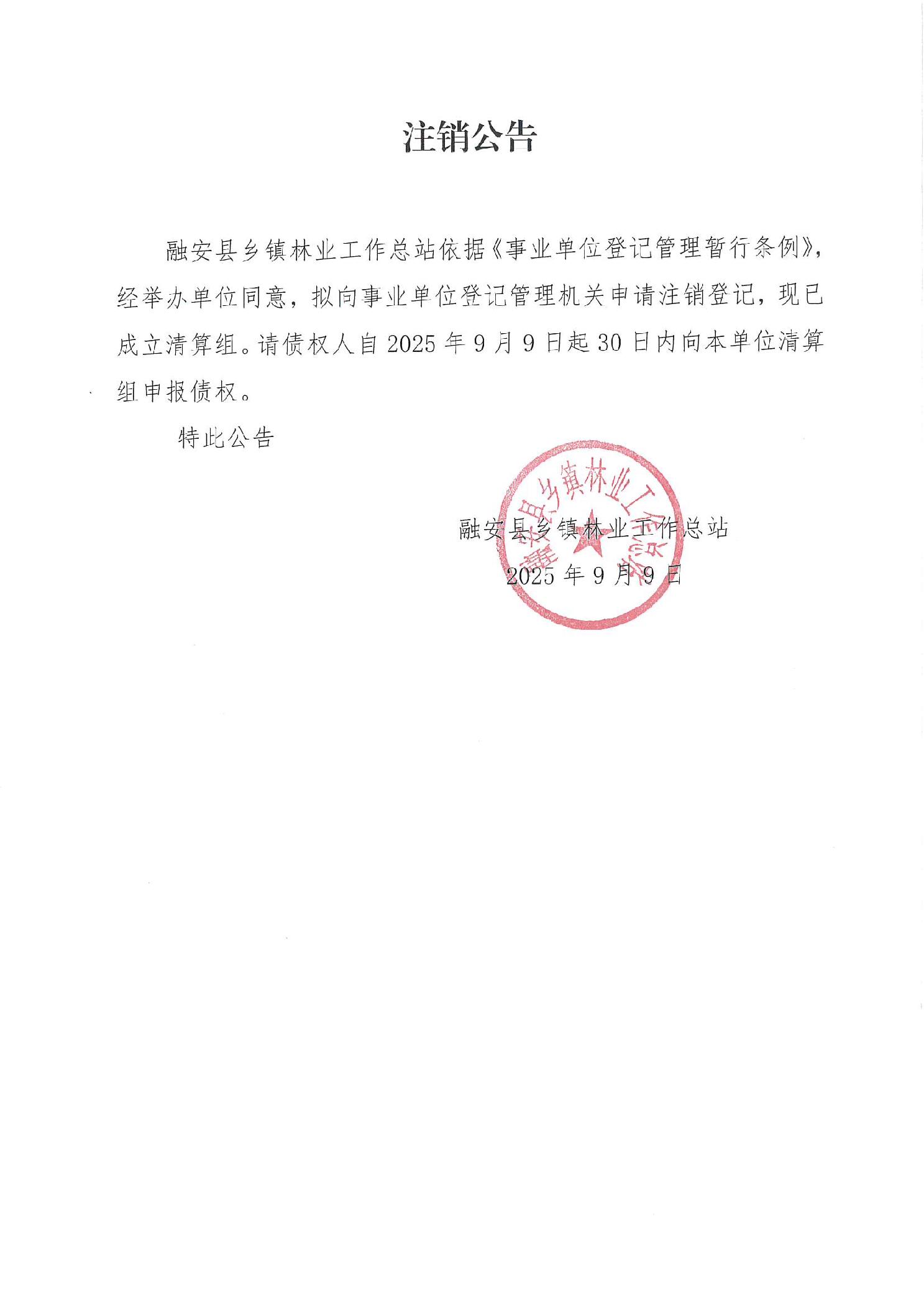 通知公告融安县乡镇林业工作总站第三次注销公告 |