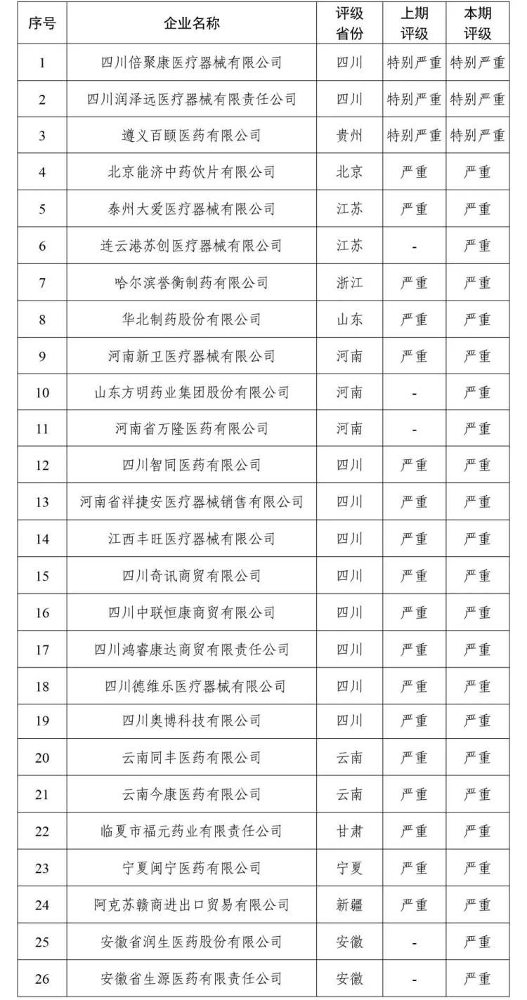 近日,国家医保局医药价格和招标采购指导中心发布了各省份评级为“特别严重”和“严重”失信的26家医药企业情况,其中23家医药企业评级为“严重”,3家医药企业评级为“特别严重”。
