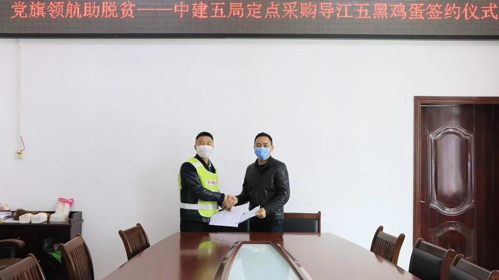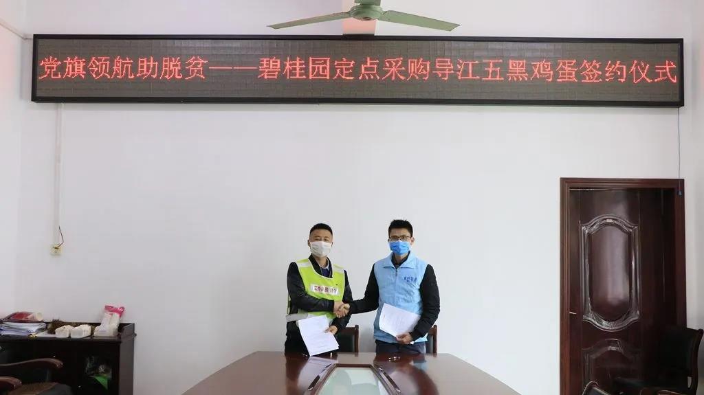 当天,在导江乡党委、政府的牵线搭桥及见证下,中建五局、鹿寨县碧桂园两家企业与“十三五”贫困村黄坭村正式签订协议,定点采购黄坭村“五黑鸡绿壳蛋”,合作共建精准扶贫“朋友圈”,两家企业成为了该村扶贫路上强大、可靠、热心的“小伙伴”。