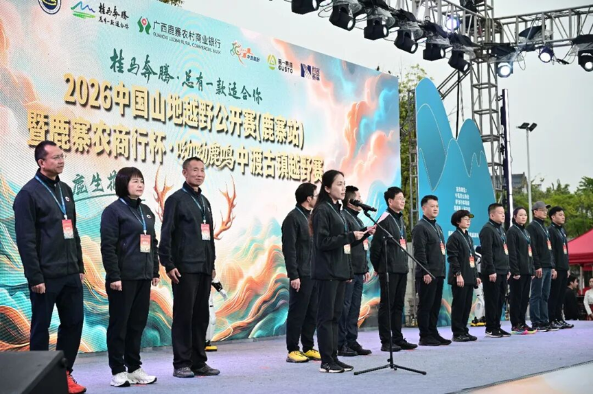 县长覃宝花在开幕仪式上致辞,向全体参赛运动员、裁判员、工作人员及各界来宾表示欢迎与感谢,并介绍鹿寨体育旅游融合发展成果,勉励选手奋勇拼搏、安全完赛,共同展现山地越野运动的魅力与风采。中国登山协会副主席张志坚,国家体育总局登山运动管理中心山地越野运动部主任王毅,县领导杨毅、张建华、朱燕文及“亚洲女飞人”韦永丽等参加开幕仪式,并为鹿骋山河30公里、鹿径寻幽16公里组鸣笛发令。