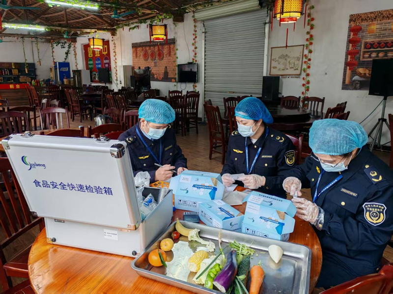驻点值守,实现监管“零死角”。赛前,保障组联合公安、卫健等部门开展拉网式排查,对中渡古镇沿街经营单位、研学活动学生就餐点及赛事周边夜市进行全面规范,重点检查证照公示、后厨操作、食品留样及临时摊贩亮证经营情况,有效提升赛事区域整体经营秩序。比赛期间,保障组实行全程驻点保障,针对赛事沿线的10个补给点安排专人定岗监管,重点核查补给食品的资质、储存条件及分发规范,并对补给点食材进行快速检测33批(次),结果均为合格,确保选手吃得放心。同时,加密赛道沿线及就餐点位的巡查频次,实现监管无盲区。