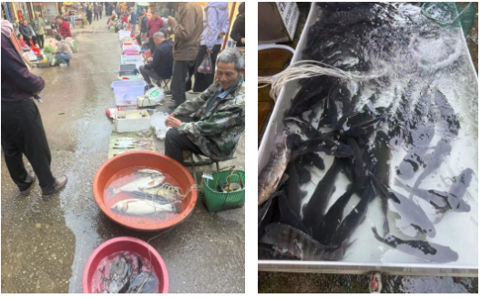 江口的圩,是有“两江水气”的。 靠着柳江和洛清江,这里的摊位从不见得有多规整,却透着一股子随性的野趣。草鱼、鲤鱼在扑腾,溅起的水花都带着江水的腥甜。