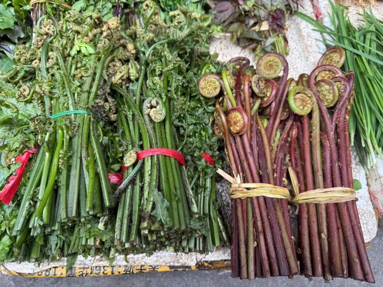 蕨菜一年只在这一季露脸,专挑那最嫩的“拳头”采——再晚几天,叶子舒展开来,就只剩下粗糙的纤维,嚼不动了。你看它蜷着毛茸茸的嫩芽,从湿漉漉的腐叶土里探出头,浑身都写着“我是大山里野出来的孩子”。