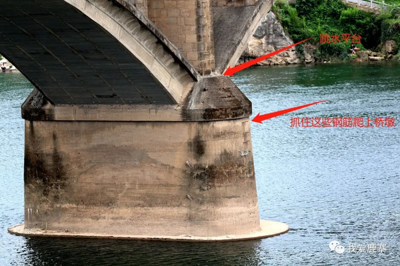 对于童年“无所畏惧”的我们来说,光是游到桥墩还不过瘾,要顺着边上超短的钢筋头爬上桥墩跳下水感受一下那股冲击力,于是爬到多高又成了一个衡量某人“水平”高低的标准。比如我只爬到过桥墩平台,跳下去也只有四五米高度,而厉害的家伙一般是从三孔算起,直至二孔、一孔,甚至直接从桥面往下跳的,这些胆大妄为的同龄人往往因为入水姿势随意而在水面上摔得皮肤红肿,别问我怎么知道的……