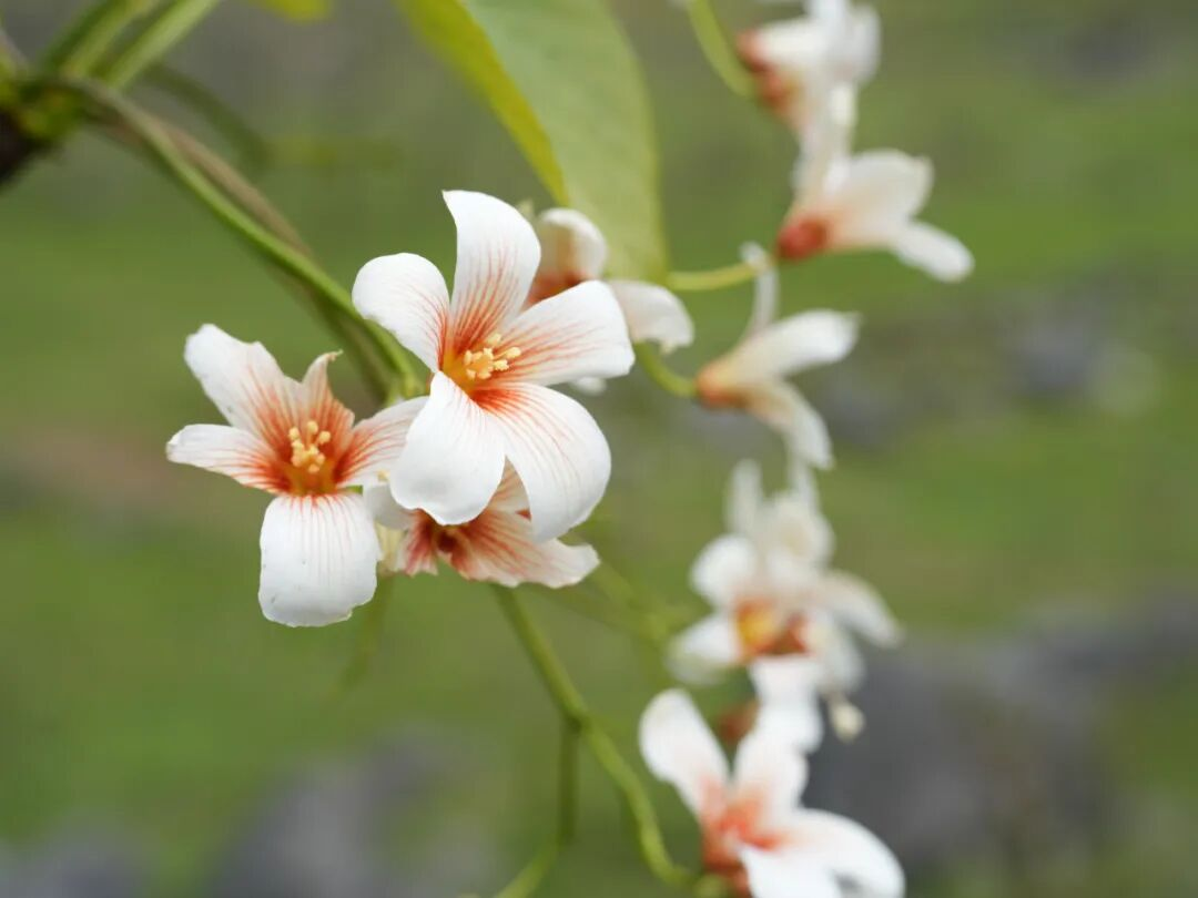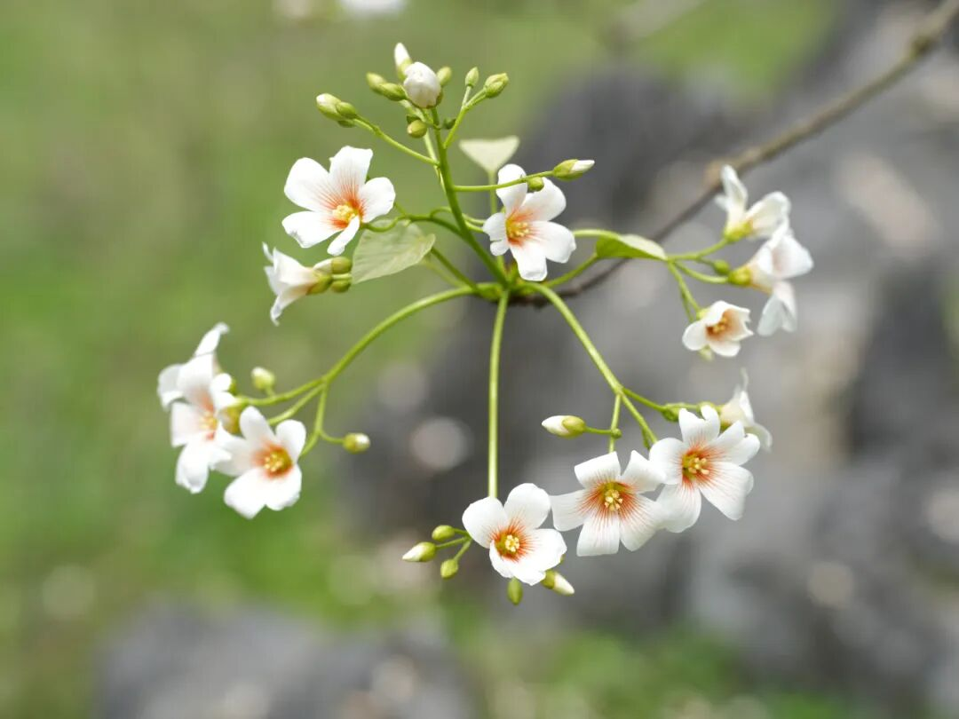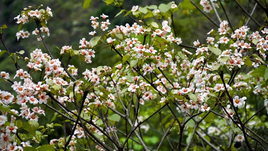 来到山尖村,沿着蜿蜒山路走进山谷,一片洁白的油桐花海便映入眼帘。油桐花小巧精致,花瓣微微舒展,花心晕染着淡粉与浅黄,清新淡雅的花香随风漫溢,沁人心脾。放眼望去,簇簇白花沿山谷向远方铺展,高低错落、疏密有致,与翠绿山峦、嶙峋青石相映成趣,勾勒出一幅清新脱俗、生机盎然的春日画卷。