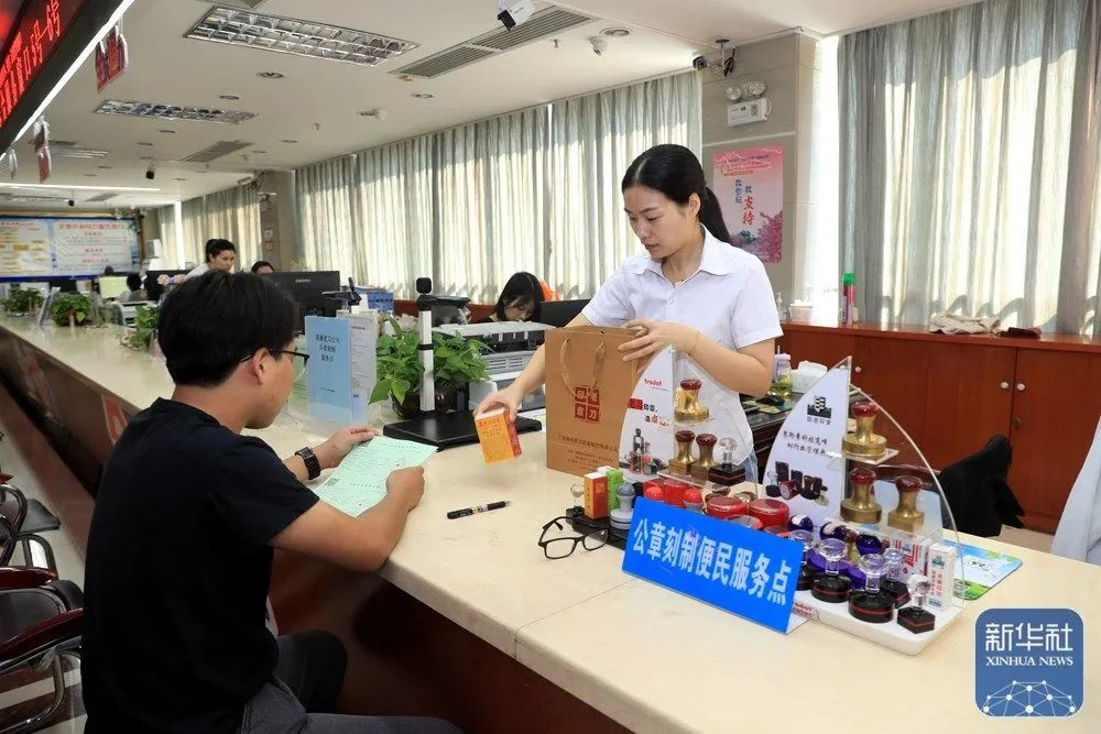 ↑鹿寨县对新设立企业实行免费刻制赠送首套5枚印章的优惠政策,为企业减负增效(肖虹路 摄)