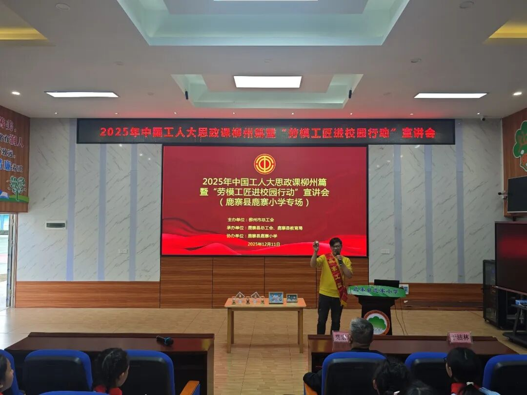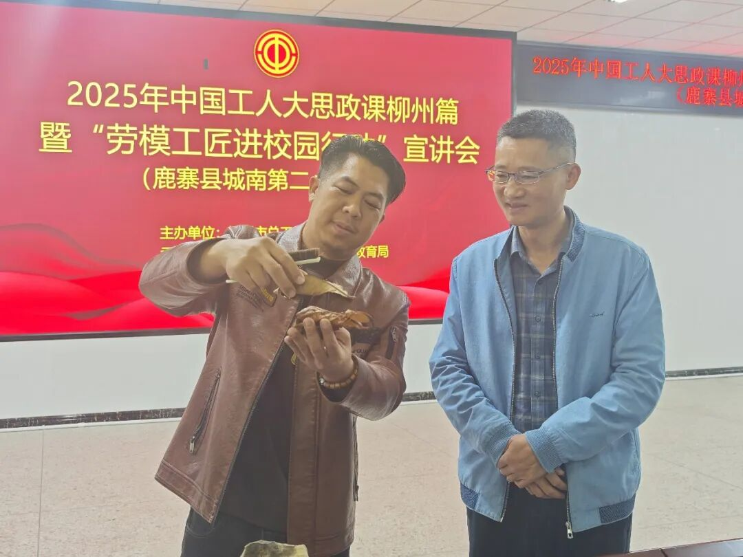 12月11日至12日,由柳州市总工会主办、鹿寨县总工会和县教育局承办的“劳模工匠进校园行动”宣讲会,分别在鹿寨小学和鹿寨县城南第二小学举行,两场活动共吸引500余名师生参与,蛋雕与木雕两位非遗传承人以匠心故事传播榜样力量。