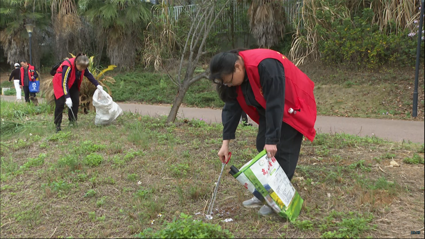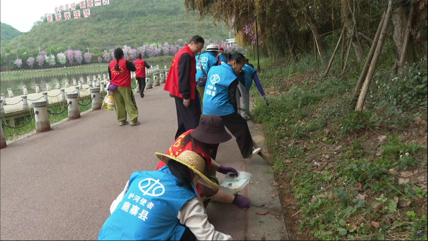 在县城的鹿鸣湖公园,志愿者们分成三个大组,大家手持扫帚、夹子、铲子、镰刀、垃圾袋等工具,对道路垃圾、杂草、白色塑料物等进行清理。大家热情高涨、干劲十足,显示了饱满的热情和积极的状态。在大家的共同努力下,公园洋溢着清新与整洁的气息。