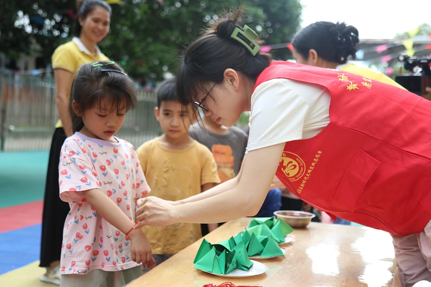 “五月五,过端午,划龙舟,敲大鼓”……近日,鹿寨县黄冕镇“我们的节日·端午”主题活动在黄冕小学附属幼儿园举行,包粽子、陆地赛龙舟、挂艾草、踩高跷、投壶等游戏,让孩子们体验端午节习俗,了解端午节的历史,感悟中华优秀传统文化。