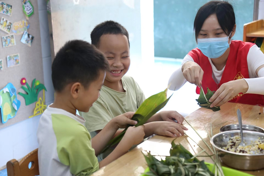 在教室里,小朋友们跟着老师学习包粽子,摆叶、放料、压实、包粽、绑紧,他们神情专注,一个个充满童趣的粽子在稚嫩而又灵巧的小手中诞生了,孩子们迫不及待地分享着自己的劳动成果,教室里洋溢着欢声笑语。