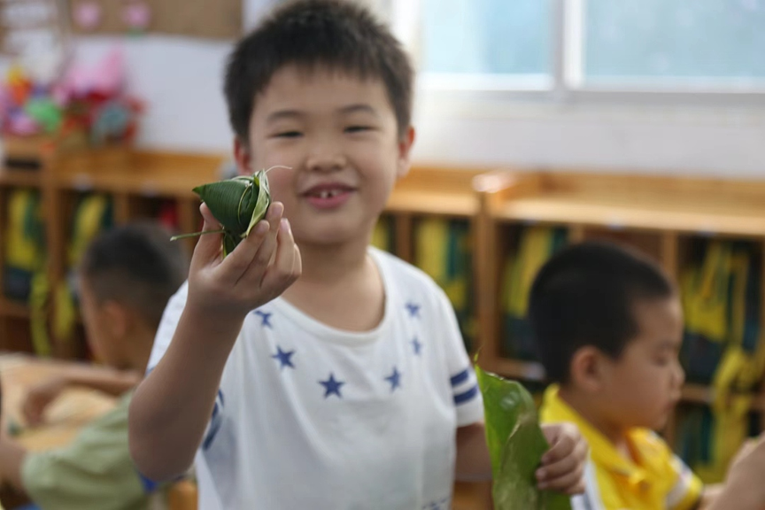 黄冕镇黄冕小学附属幼儿园小朋友杨景文说:“端午节是为了纪念屈原,这是我第一次包粽子,我感觉好开心,好快乐!”