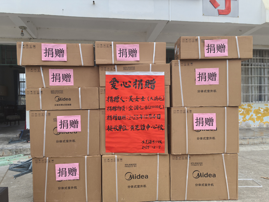 心系教育梦,助力共成长。吴女士深知教育对家乡发展的重要性,始终关注教育事业发展。她主动与黄冕镇中心校对接,详细了解学校实际需求,精准捐献7台空调,有效弥补了学校教学物资短板,切实改善了师生教学学习条件,为家乡教育高质量发展注入了温暖力量。