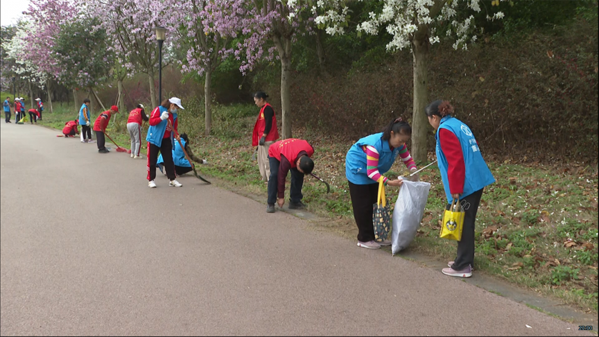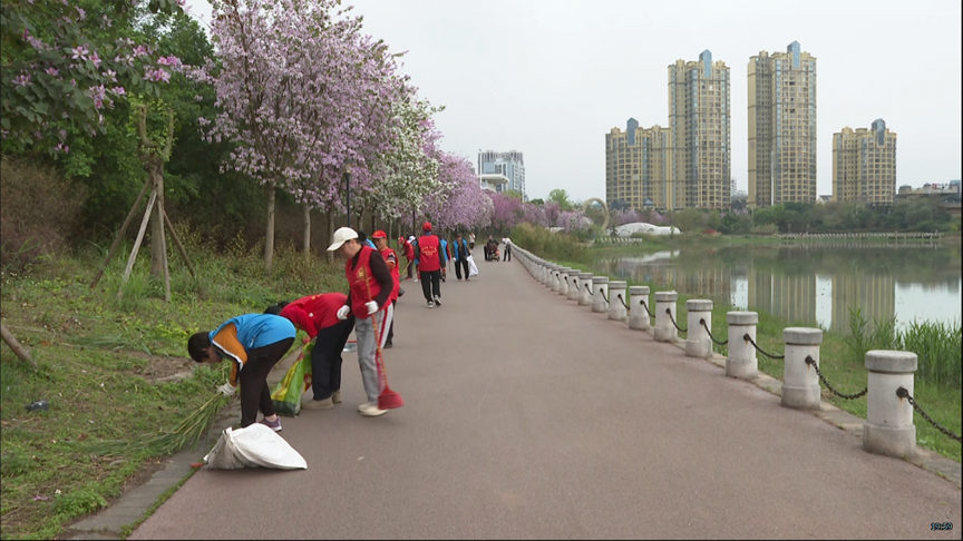 在县城的鹿鸣湖公园,志愿者们分成三个大组,大家手持扫帚、夹子、铲子、镰刀、垃圾袋等工具,对道路垃圾、杂草、白色塑料物等进行清理。大家热情高涨、干劲十足,显示了饱满的热情和积极的状态。在大家的共同努力下,公园洋溢着清新与整洁的气息。