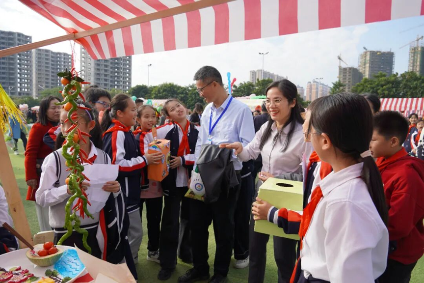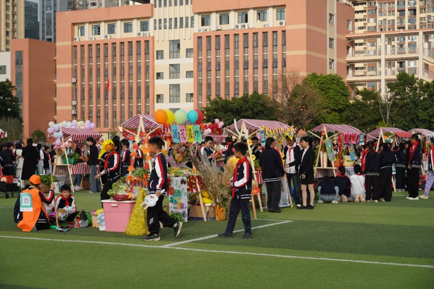 在学生劳动丰收成果展暨果蔬市集上,学生们化身为“小摊主”,在班级摊位推销自主种植的瓜果蔬菜、鲜花及创意果蔬拼盘,在互动中体验劳动的价值与乐趣。