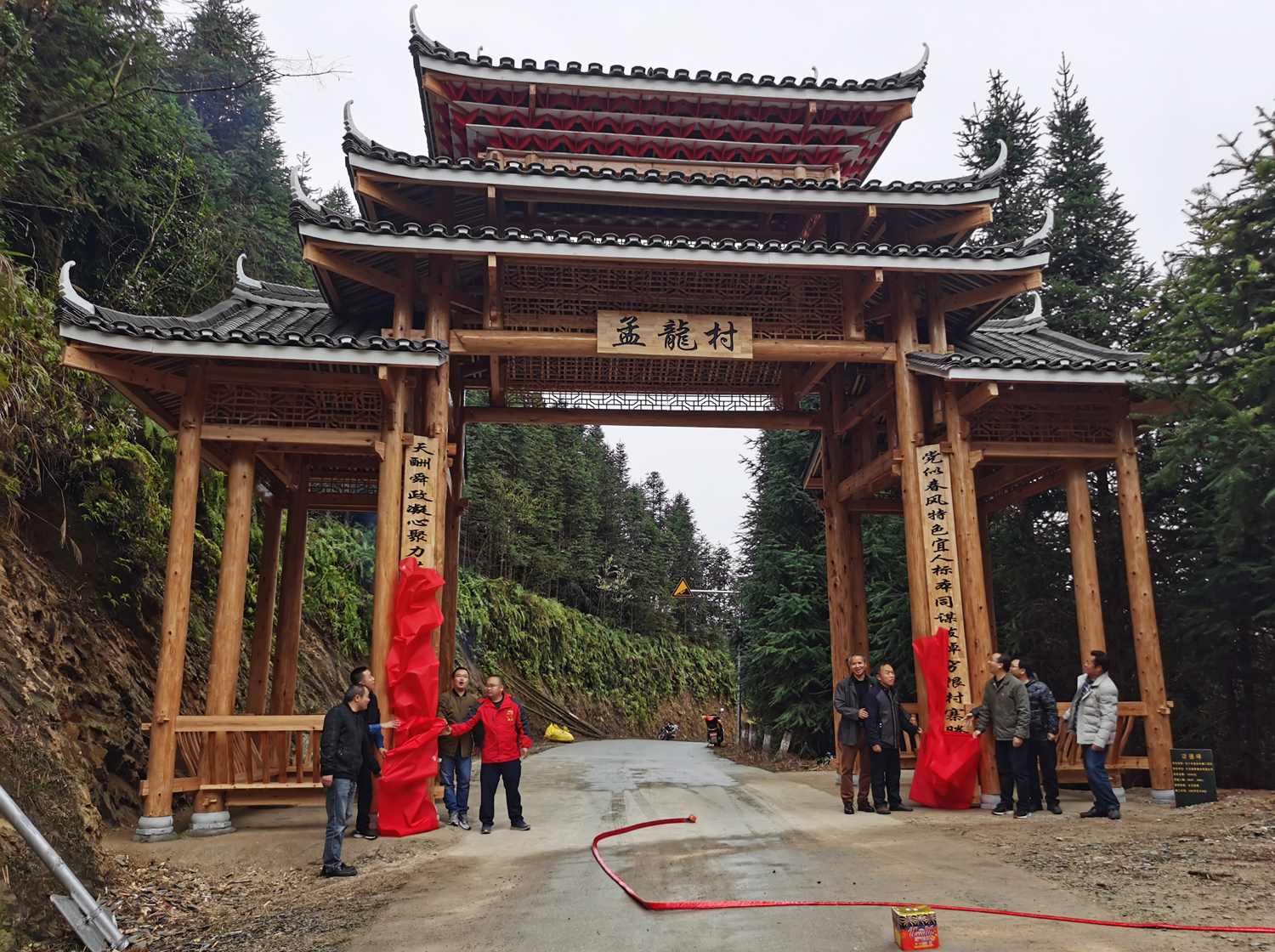 2月8日,鹿寨县突击队队长、县人大常委会副主任莫兆坚和突击队员,资助方中交路桥建设有限公司泉南高速公路桂柳改扩建3标段项目部代表,三江侗族自治县良口乡政府领导与孟龙村“两委”负责人,共同为孟龙村寨门揭牌。