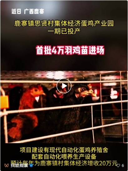 “咕咕、咕咕……”近日,鹿寨县鹿寨镇思贤村屯连屯的山坳里,清脆的鸡鸣声此起彼伏,打破了山野的宁静。鹿寨镇思贤村集体经济蛋鸡产业园迎来重要节点,首批4万羽蛋鸡顺利进场,标志着项目一期正式投产运营。