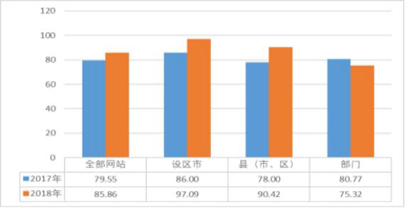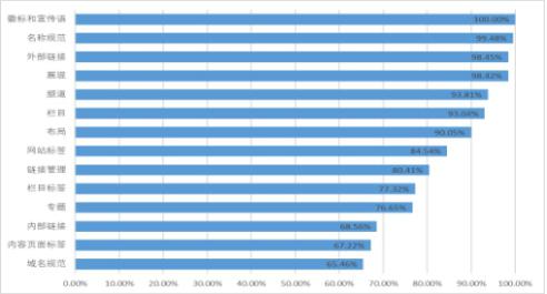 评估结果显示,2018年全区政府网站绩效评估网页设计规范指标合格率92.55%,同比下降3.62%。58个自治区部门网站域名结构不规范,未使用“×××××. gxzf.gov.cn”结构的二级域名,占比92.06%。91个政府网站历史性专题未归档,占比47.40%。61个政府网站内部地址不清晰,占比31.70%,未体现内容分类和访问路径的逻辑性,不便于用户识别;38个政府网站打开非政府网站链接时无提示信息,占比20%。域名规范、内容页面标签、内部链接三个指标平均得分率较低,拉低了网页设计规范指标的整体成绩。