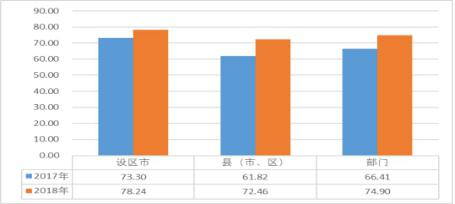 评估结果显示,全区政府网站持续创新发展,取得明显进步。2018年全区政府网站绩效评估平均分为77.02分、同比增长4%,总体合格率95.70%、同比增长14.30%,其中,设区市、县(市、区)人民政府门户网站绩效评估合格率100%、同比增长7.46%,自治区部门网站绩效评估合格率87.30%、同比增长4.35%;得分在80分及以上的政府网站数量增幅明显,县(市、区)人民政府门户网站差距逐渐缩小;自治区农业农村厅、广西税务局、自治区扶贫办、自治区人力资源社会保障厅、自治区统计局、自治区自然资源厅、南宁市、柳州市、柳州市柳江区、南宁市武鸣区、鹿寨县、马山县、东兴市、南宁市兴宁区、钦州市钦北区、贵港市港北区等16个政府网站绩效评估总分超过90分。自治区地方金融监管局、自治区农业农村厅、自治区生态环境厅、自治区公安厅、梧州市、南宁市武鸣区、兴安县、凭祥市、南丹县、桂平市、贵港市港北区、大新县、三江侗族自治县、上思县等14个政府网站进步幅度较大。如图1所示: