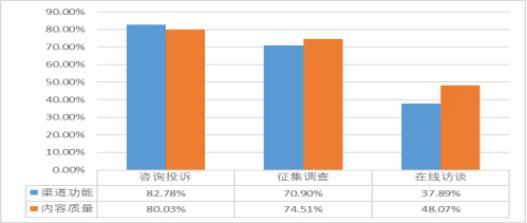 自治区部门网站的互动交流比较少,业务职能较少的部门征集调查、在线访谈等互动交流工作先天不足。互动交流的深度功能明显不足,超过30%的网站未通过梳理问答知识库分析常见问题,超过40%的网站未提供征集调查的在线意见提交、结果查看、意见及采纳情况统计公开等功能。33%的网站未设置访谈栏目,访谈预告、在线提问、实时交流等功能的实现程度均不足30%,多数在线访谈栏目都是以新闻发布会文字记录、记者采访文字记录等形式为主,未实现网上适时在线交流,如凭祥市人民政府门户网站在线访谈栏目均是新闻发布会文字记录。