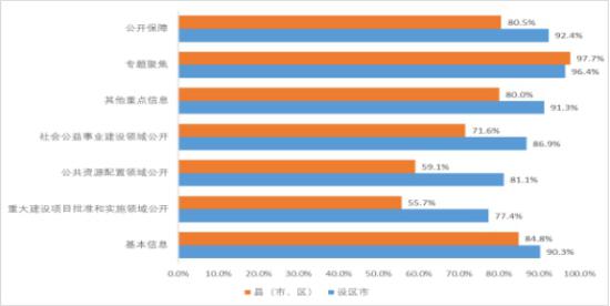 一是信息公开个别指标存在短板。全区政府网站数据开放仍然是空白,有些政府网站虽然设置了数据开放栏目,但只公开统计数据,未提供任何机器可读的数据集和数据接口;62%的政府网站未提供便利的数据查询和下载功能;55.70%的政府网站未提供专门的文件资料搜索功能;53.60%的政府网站仅公开发展规划、工作计划等信息,未公开发展规划和工作计划的进展实施情况信息;50.50%的政府网站未按主题或地区等维度对数据进行科学合理分类。二是重点领域信息公开质量有待提高。重大建设项目批准和实施领域公开、公共资源配置领域公开、社会公益事业建设领域公开指标的平均得分率均不足80%。如,60%的县(市、区)网站未公开国有产权交易信息。信息公开的准确度不高,有些网站将项目批准服务与项目批准结果信息混淆,如合浦县人民政府门户网站“项目投资批准”、“项目报建批准”应公开批准指南,而不是批准结果信息。信息公开栏目缺乏有效规划,信息内容不易查找,如贵港市覃塘区重大建设项目栏目未设置项目批准服务、项目批准结果、项目招投标等子栏目,只是简单堆砌项目信息。三是信息公开目录的建设和维护仍然不足。11%的政府网站未发布信息公开目录,如自治区北部湾办、钦州保税港区、南宁住房公积金管理中心区直分中心、梧州市万秀区、田东县等20个政府网站;37.50%的政府网站信息公开目录未按照主题、机构类别进行合理分类。43.20%的政府网站信息公开目录不能关联到内容,如百色市、贺州市、宾阳县、桂林市叠彩区、自治区林业局、自治区外事办等政府网站信息公开目录仅提供了静态页面,不能链接到有关栏目内容。