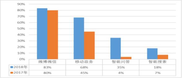18%的政府网站实现了智能搜索,多数政府网站仅提供传统站内搜索功能,未提供错别字自动纠正、关键词推荐、拼音转化搜索、通俗语言搜索等智能化服务功能,与2017年相比没有变化。25%的政府网站实现了智能问答,但未实现政府网站资源与服务平台资源的聚合,比2017年稍有上升。创新发展指标平均得分率最低,152个政府网站未提供多语言版本、占比79.20%,全区政府网站仍处于以夯实基础、完善功能、保障内容为主的发展阶段。