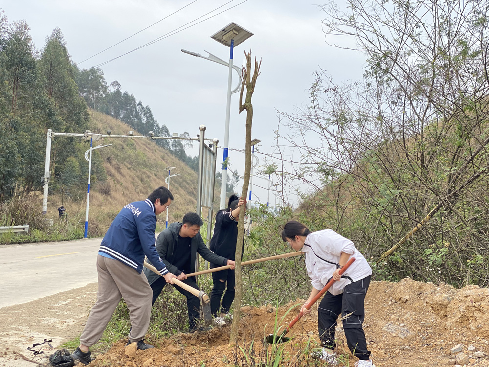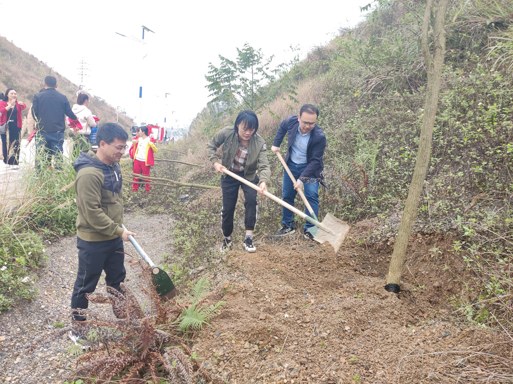植树现场呈现出一幅忙碌有序的劳动景象,参加植树的党员、干部、志愿者热情高涨、干劲十足。大家挥锹铲土、搬运树苗、扶苗培土、踏土夯实、开车浇水,各个环节衔接有序,忙得满头大汗,但心里满是热情与喜悦。经过2个多小时的忙碌,共栽种100余株桂花、50株黄花风铃木,一棵棵新种的树苗整齐排列、迎风挺立,静待新芽吐绿。