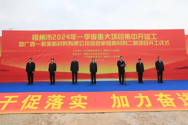 项目建设是经济发展的“压舱石”,也是全方位推动高质量发展的“强引擎”。2月21日上午,柳州市在我县广西一家美新材料有限公司绿色家居新材料二期项目现场,举行柳州市2024年一季度重大项目集中开竣工暨广西一家美新材料有限公司绿色家居新材料二期项目开工仪式,75个重大项目集中开竣工,总投资达251亿元,为柳州市开好局、起好步,冲刺项目建设“开门红”、加快高质量发展注入新动能。