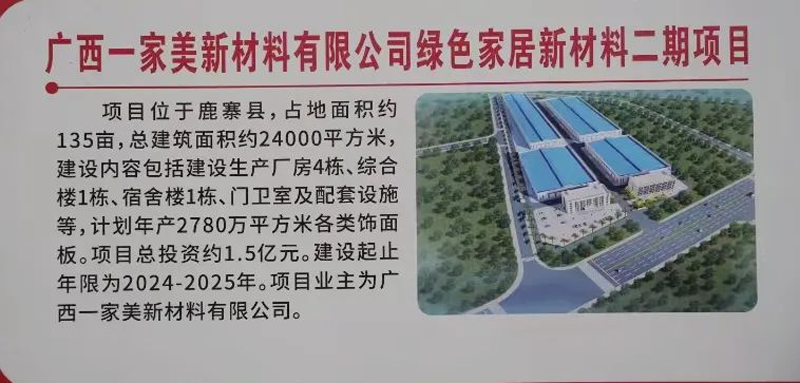 据悉,广西一家美新材料有限公司绿色家居新材料二期项目是广西桂中(鹿寨)现代林业科技产业园2024年第一个新建开工项目,占地面积约135亩,计划年产2780万平方米各类饰面板,项目总投资约1.5亿元。