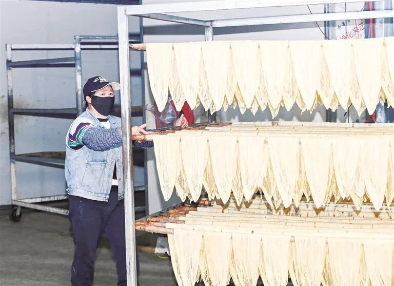 ▲工人把腐竹摆放到架子上