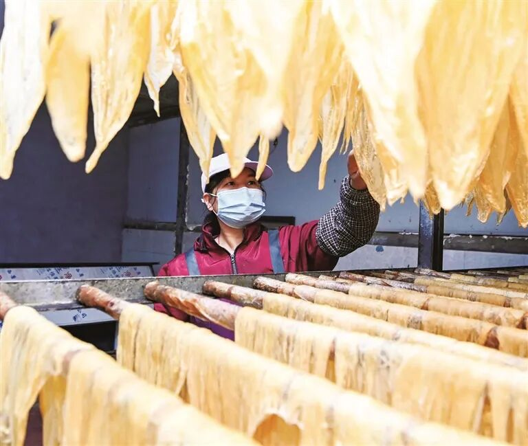 200多平方米的作坊内,大型灶台上排列着90个长方形隔槽。槽内乳白色豆浆经温火慢熬,表面逐渐凝结成一层薄膜。灶台旁,汤群英与工人手持竹片,娴熟地将薄膜从滚烫的浆面挑起,快速地挂到隔槽上方的竹竿上,动作连贯利落。经过反复操作,竹竿上很快挂满了新制的腐竹。